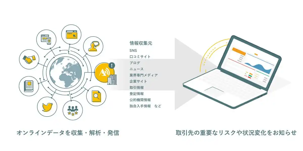 )は、企業や自治体のHPに掲載された情報や、SNSや口コミなどインターネット上で投稿された情報をAI技術で収集・解析し、提供するクラウドサービスです。新規取引時の与信判断、既存取引先の継続的な与信管理、さらに売掛保証までを一括して行うことができます。収集・判断の難しいネット上の情報を、与信への影響度を診断したうえで提供するため、インターネット上の情報を活用した高精度な与信管理を、簡単に、低価格で導入できます。それにより、取引先の情報収集に関わる業務負荷を大幅に削減し、スマートフォンやPCから取引先を登録しておくだけで、迅速にリスクに対応できます。 |