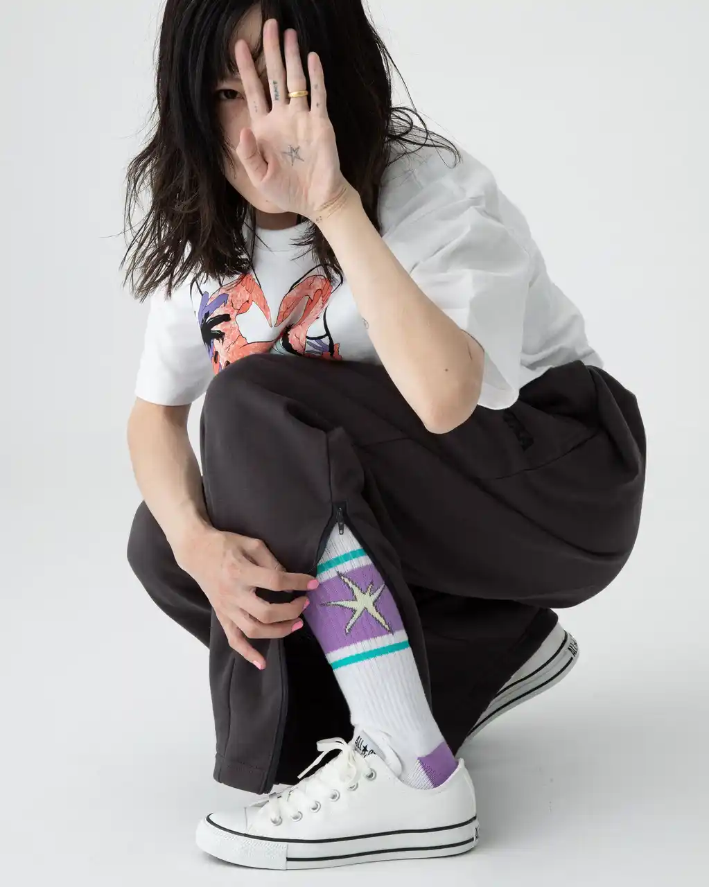 子のキャラクターを巧みな描写と独創的な世界観で描き出すアーティストです。ポップでキュートなイラストレーションを描く一方で、歪んだ目、無表情といった特徴的な描写には自⼰言及的な深みがあります。 |