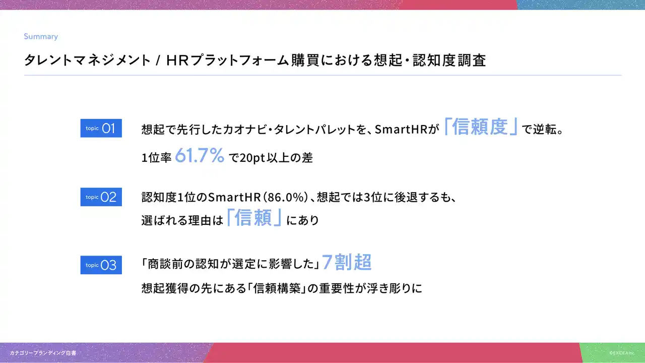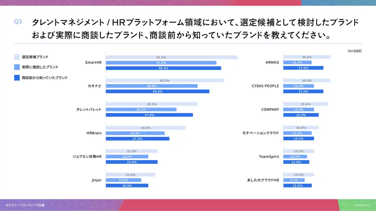 以上の結果から、タレントマネジメント/HRプラットフォームの選定においては、単なる知名度を超えた「カテゴリーブランディング」の確立が不可欠であると言えます。 |