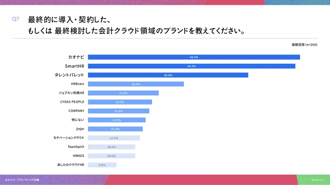 「Q7. 最終的に導入・契約した、もしくは最終検討したタレントマネジメント/HRプラットフォーム領域のブランドを教えてください。(複数回答)」(n=200)と質問したところ、「カオナビ」が44.5%、「SmartHR」が44.0%、「タレントパレット」が34.0%という回答となりました。 |