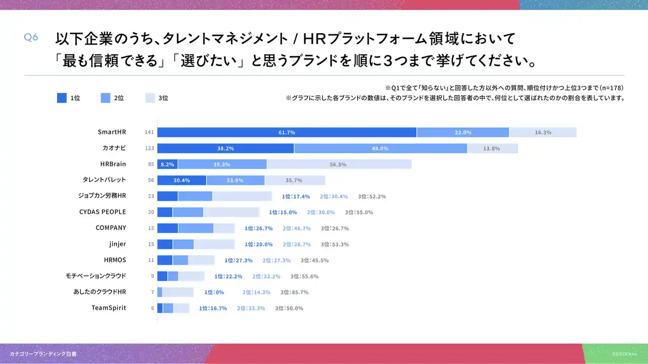 「Q6. Q1で全て「知らない」以外を回答した方にお聞きします。以下企業のうち、タレントマネジメント/HRプラットフォーム領域において「最も信頼できる」「選びたい」と思うブランドを順に3つまで挙げてください(順位付けかつ上位3つまで)」(n=178)と質問したところ、SmartHRは「1位」が61.7%、カオナビは「1位」が38.2%、HRBrainは「1位」が8.2%という回答となりました。 |