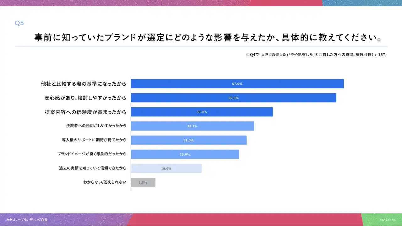 「Q5. Q4で「大きく影響した」「やや影響した」と回答した方にお聞きします。事前に知っていたブランドが選定にどのような影響を与えたか、具体的に教えてください。(複数回答)」(n=142)と質問したところ、「他社と比較する際の基準になったから」が57.0%、「安心感があり、検討しやすかったから」が55.6%、「提案内容への信頼度が高まったから」が38.0%という回答となりました。 |