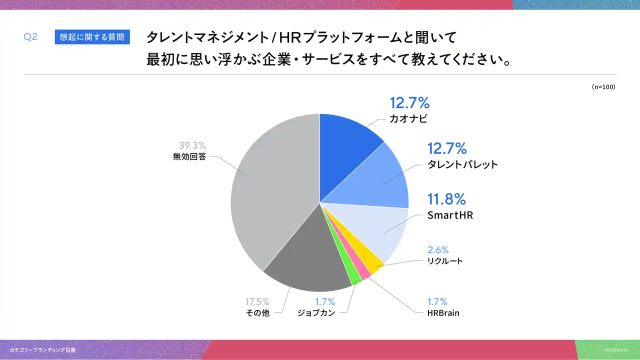 「Q2. タレントマネジメント/HRプラットフォームと聞いて最初に思い浮かぶ企業・サービスをすべて教えてください。(自由記述)」(n=100)と質問したところ、カオナビが12.7%、タレントパレットが12.7%、SmartHRが11.8%という回答となりました。