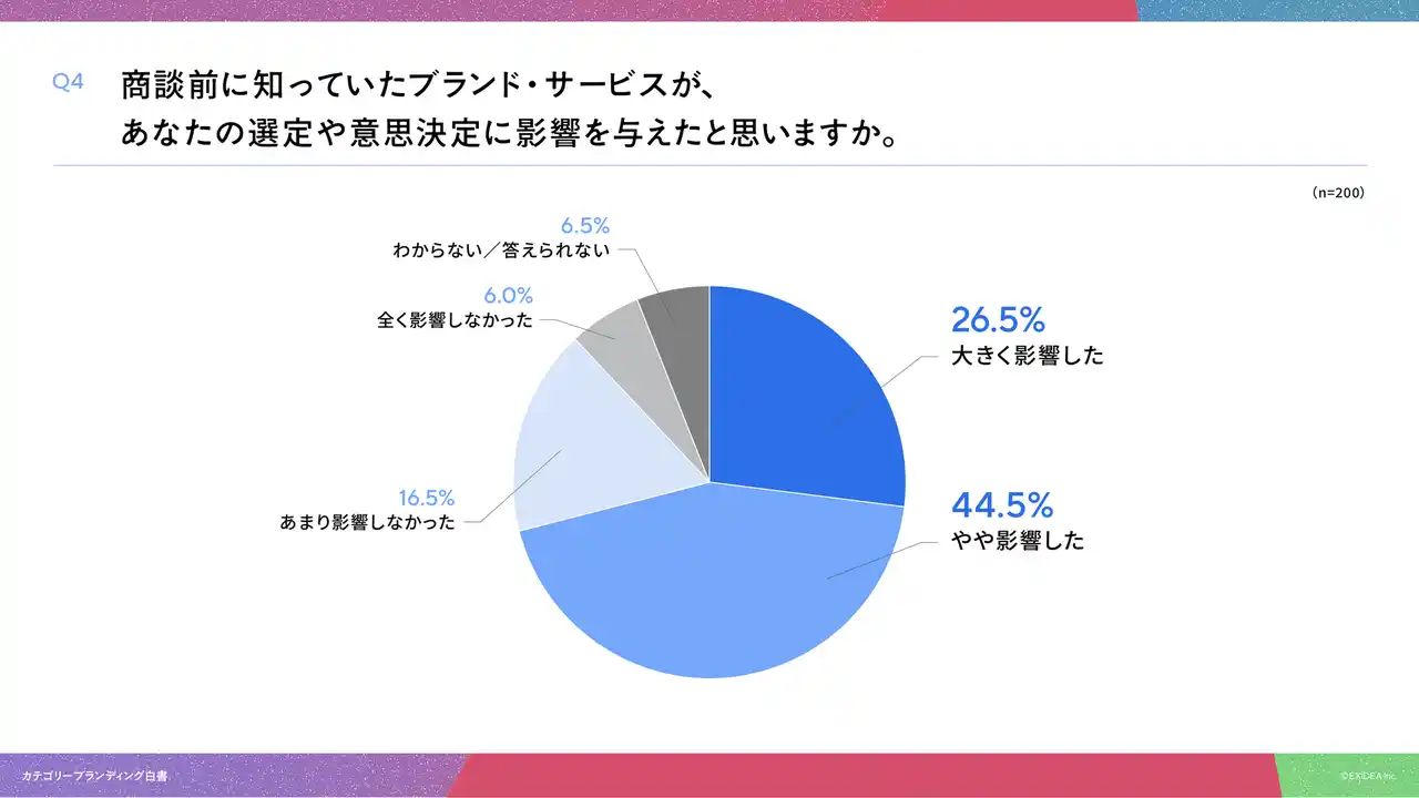 「Q4. 商談前に知っていたブランド・サービスが、あなたの選定や意思決定に影響を与えたと思いますか。」(n=200)と質問したところ、「大きく影響した」が26.5%、「やや影響した」が44.5%という回答となりました。 |
