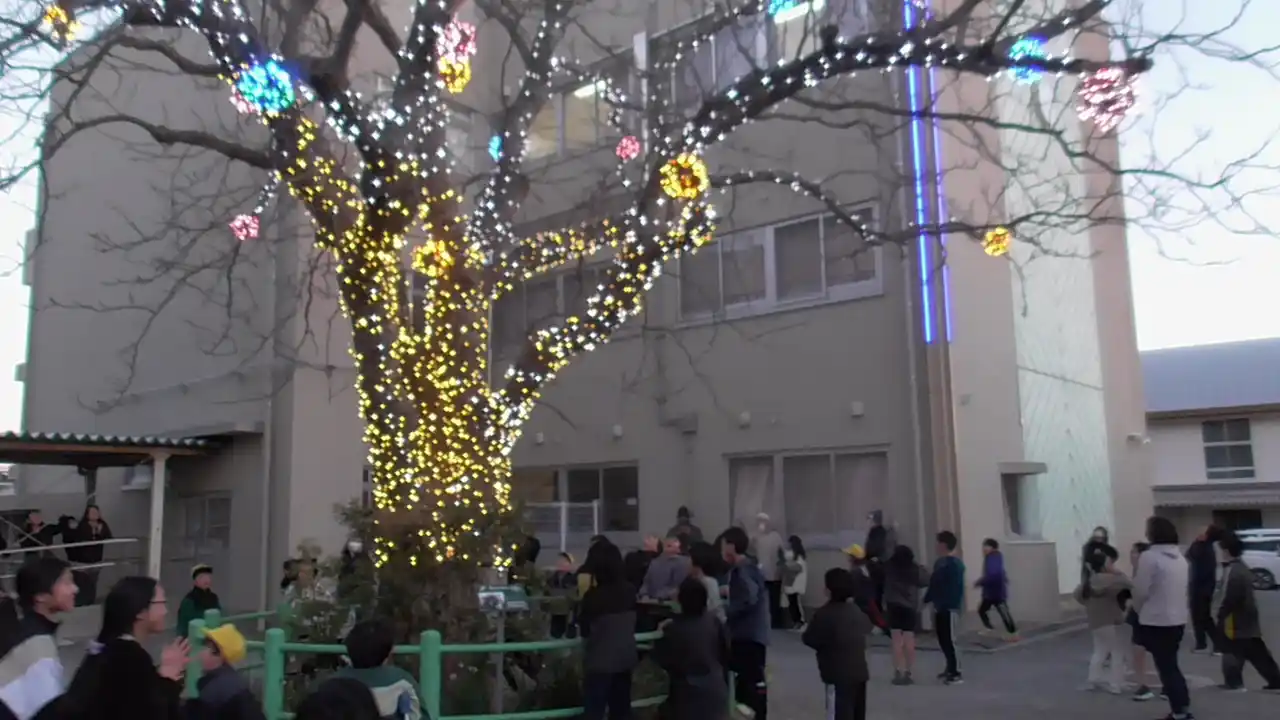 児童の下校後17時からは、校舎に設置された「ⅬEⅮ光センサアラートシステム」の前に立つ、樹齢146年のシンボルツリー「無患子(ムクロジ)の木」に施されたイルミネーションの点灯式が行われました。 |