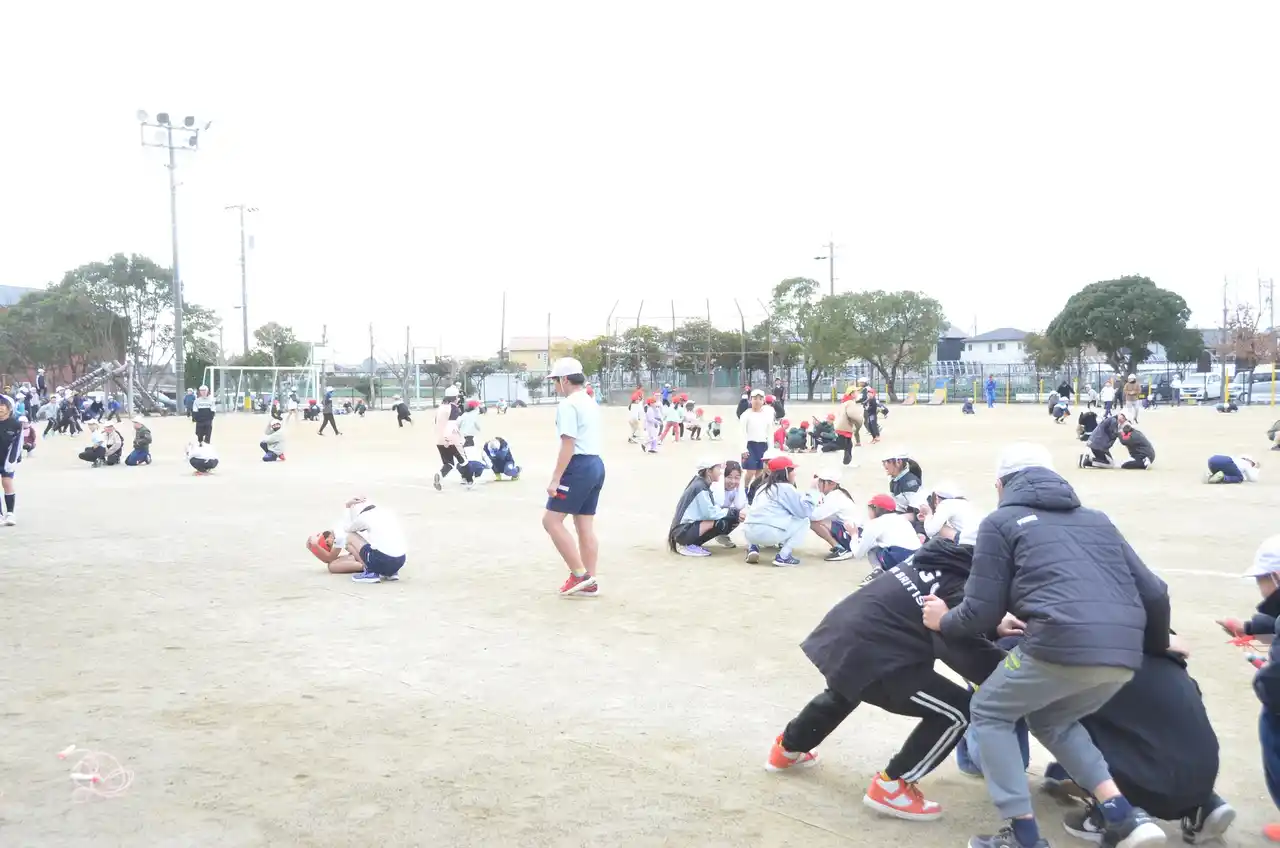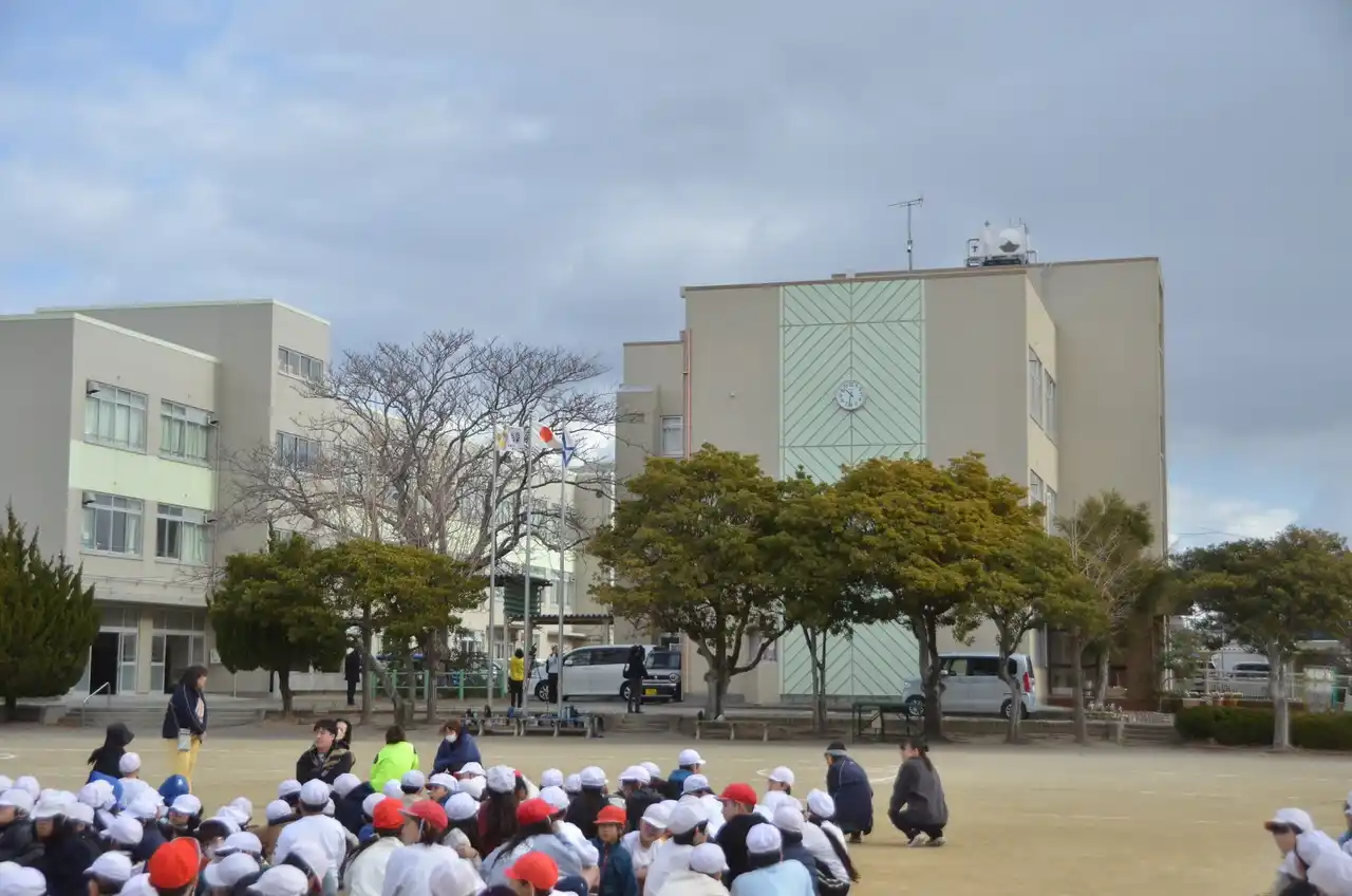 この日は出前授業に先立ち、全校児童568人を対象にした地震避難訓練が実施されました。地震発生の放送が流れると、屋外にいた児童はその場にかがんで身を守りました。揺れがおさまると、運動場に集まり、校舎内の児童も防災頭巾をかぶって速やかに運動場へ避難し整列。緊迫感のある訓練となりました。 |