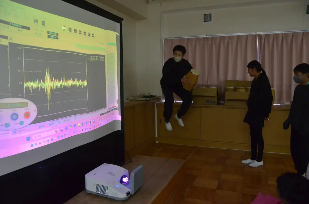 また、教室の床に設置された揺れを測定するセンサの見学では、児童たちがその場でジャンプをして意図的に振動を起こし、数値が変化する様子を興味深そうに確認していました。 |