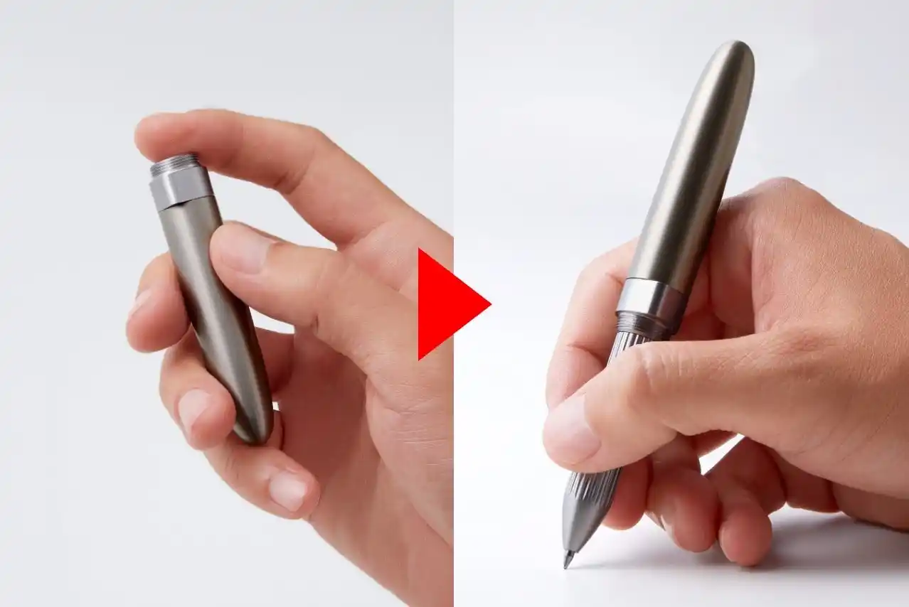 「持ち運びやすさ」を追求し、ボディを極限まで短く設計しました。しかし、短すぎては書きにくいという問題があります。本製品は、筆記時にキャップを後ろに装着(ポスト)することで、一般的なペンと同等の快適な長さを確保。ポケットにすっぽり収まる携帯性と、本格的な書き心地を両立させました。 |