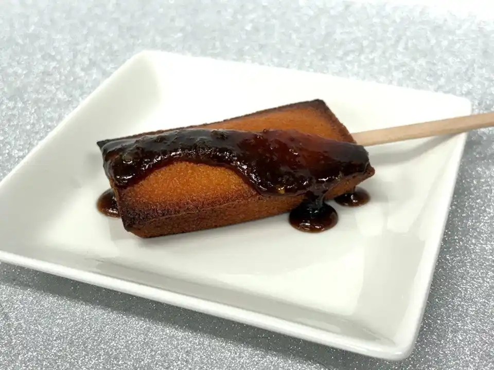 ▲フィナンシェに串をさして五平だれをかけて食べる新感覚スイーツ |