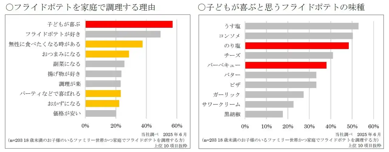 フライドポテトは、「子どもが喜ぶ」という理由で調理されることが多く、子育て層を中心に幅広く需要が伸びています。また、「のり塩」や「バーベキュー」は、子どもが好むフライドポテトの味わいとして人気が高く、スパイスやハーブの風味と組み合わせることで冷凍フライドポテトのアレンジの幅が広がる可能性があります。 |