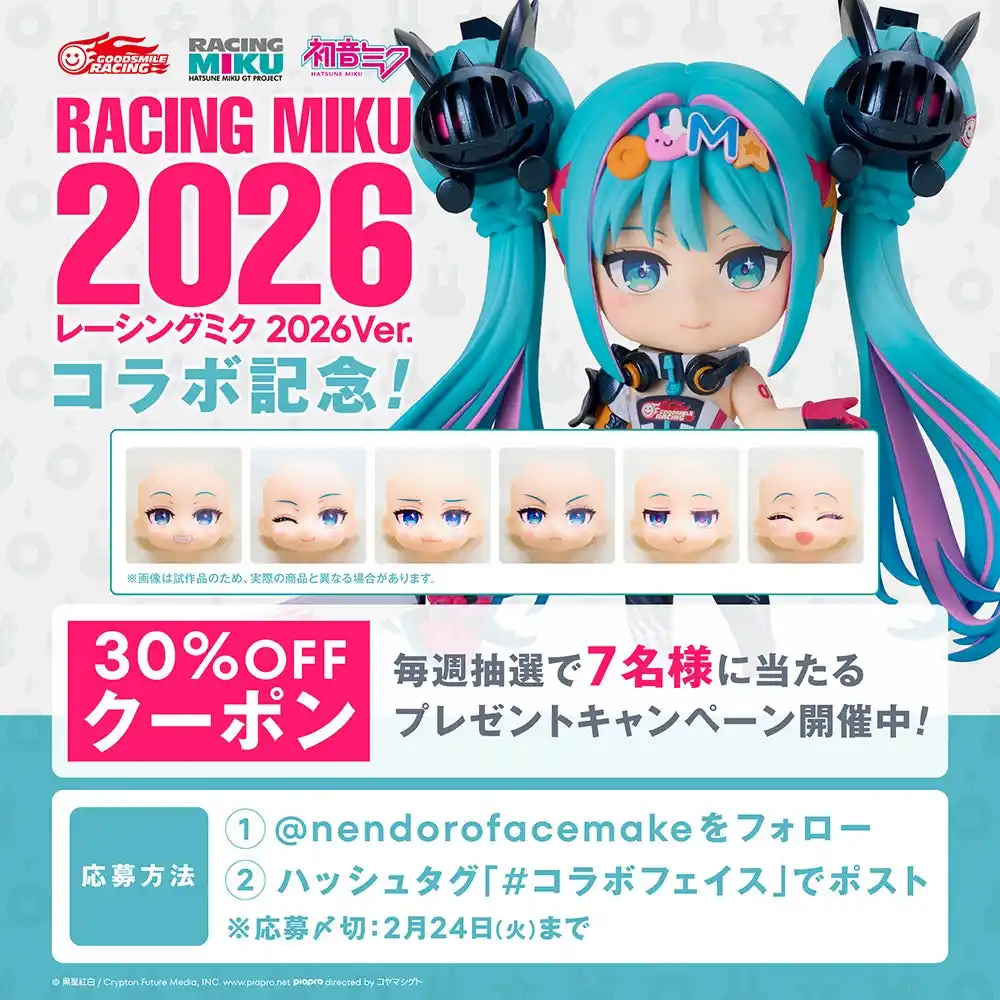 株式会社グッドスマイルカンパニー(本社:東京都千代田区、代表取締役社長:岩佐厳太郎、以下 グッドスマイルカンパニー)の公式サービス『ねんどろいどフェイスメーカー』は、ただいま予約受付中の『ねんどろいど レーシングミク 2026Ver.』とのコラボを開催中! |