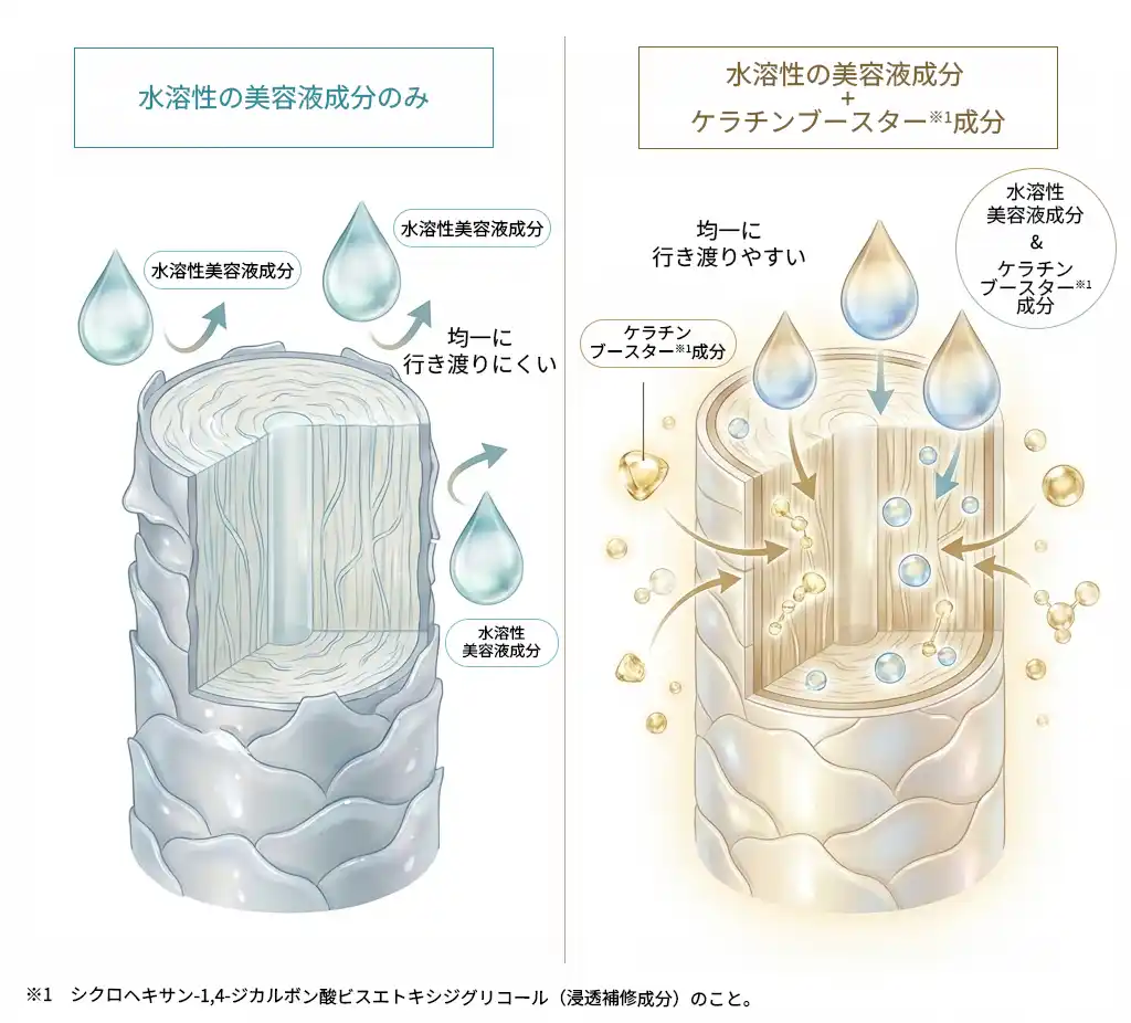 髪や頭皮は水をはじきやすい疎水性であるため、水溶性の美容液成分は髪表面に均一に行き渡りにくい性質があります。そこで、水にも油にもなじむ特性を持つ「ケラチンブースター(※1)成分」を組み合わせて配合することで、髪にとって重要なタンパク質であるケラチン(※2)を含む美容液成分が、髪の内部まで浸透しやすくなるようサポートします。 |