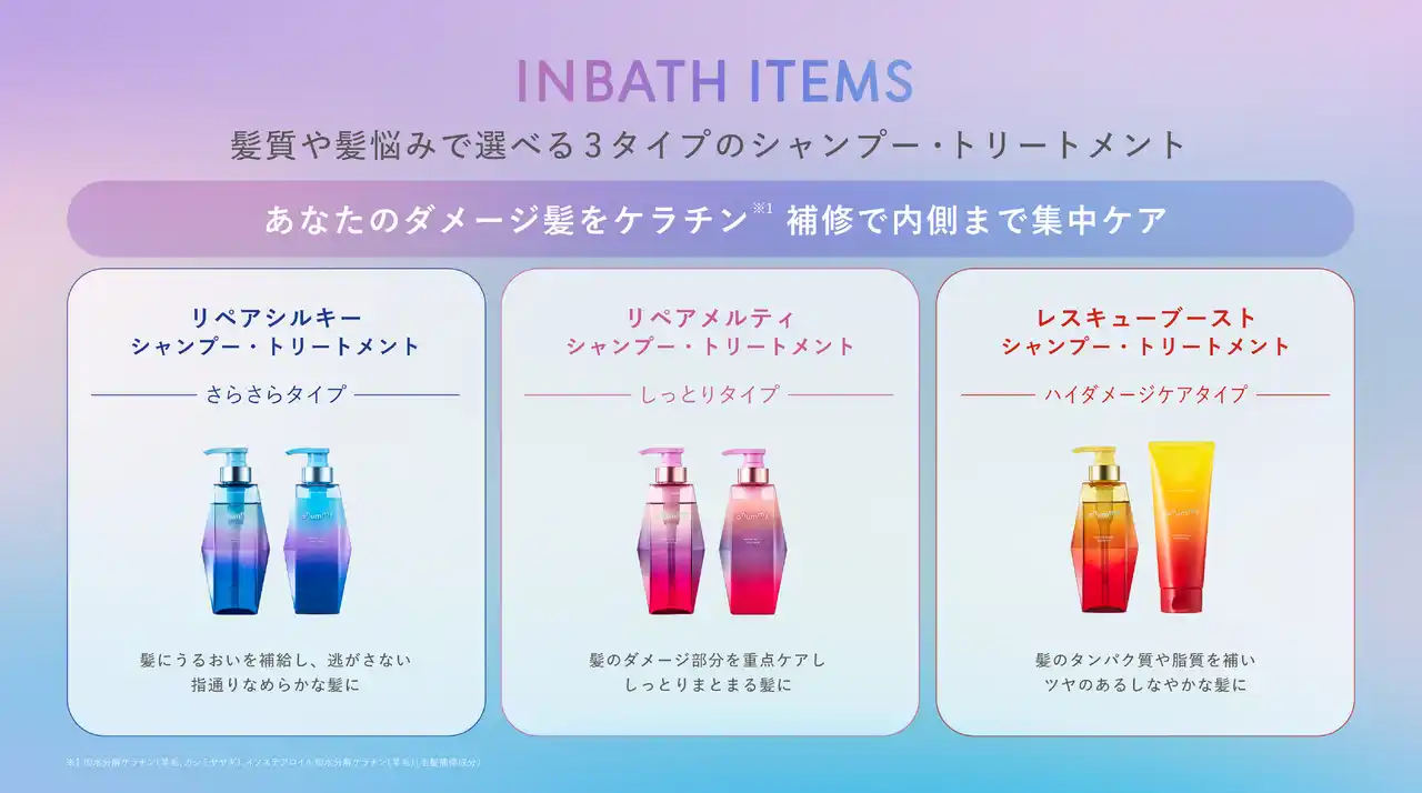 髪を伸ばす時間そのものを楽しむダメージヘアケアブランドとして、 2026年3月に誕生。カラーやブリーチ、日々の摩擦によるダメージに寄り添う処方設計で、髪質や髪悩みに応じた3タイプのシャンプー・トリートメントと、なりたい仕上がりに合わせて選べるアウトバスアイテムを展開しています。 |