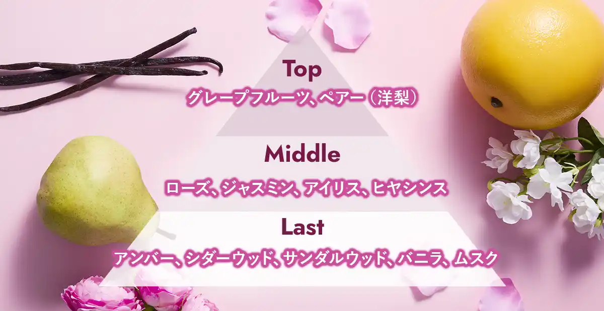 みずみずしいピーチの甘さに、上品なガーデニアが重なり合う、愛されフローラルの香り。 |