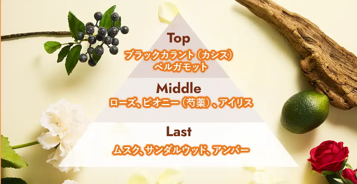 深みのあるアンバーに、優雅なローズが溶け合う、凛とした華やかさと大人の色気を感じさせる香り。 |