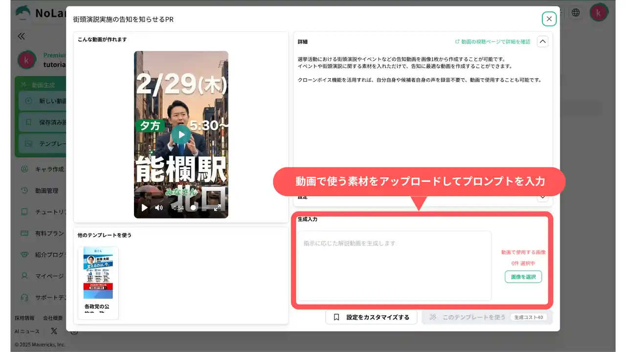 日本発、動画生成AI「NoLang(ノーラン)」を提供する株式会社Mavericks(本社:東京都文京区、代表者:Founder CEO 奥野 将太)は、この度、選挙活動に特化した動画テンプレートの提供を開始しました。候補者の自己紹介、街頭演説の告知、公約の要約解説など、選挙陣営が直面する情報発信の課題をAIで解決。写真1枚とテキストのみで、専門スキル不要の高品質な選挙動画を最短数秒で生成可能に。縦型動画を活用したSNSでの発信強化により、有権者の政治理解を支援し、広く政治活動における動画作成と活用を強力に推進します。 |