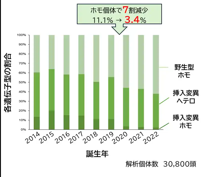 | 2014年から2022年までに生まれたミニチュア・ダックスフンド30,800頭の遺伝子型データを解析した結果、リスクアレルのホモ接合個体の割合が、全頭での検査が本格的に開始された2019年から翌2020年にかけて、約70%減少(11.1%→3.4%)しました。これは、ブリーダーやペットショップが遺伝子検査の結果に基づき、リスクの高いホモ接合個体の繁殖を避けるという適切なブリーディングが短期間で効果を発揮したことを示しています。 | |||