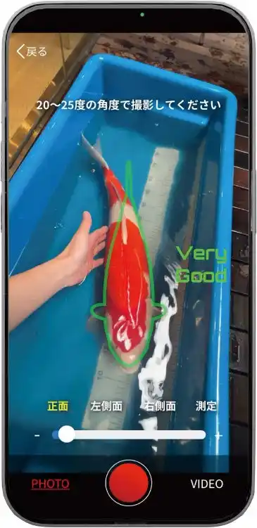 〈写真〉 鯉の頭を下にして、表示されるガイドに沿って「正面写真」を撮影。体はまっすぐで口は閉じ、ヒレが開いている瞬間を狙うのがポイント。※加工写真は対象外となるので注意 |