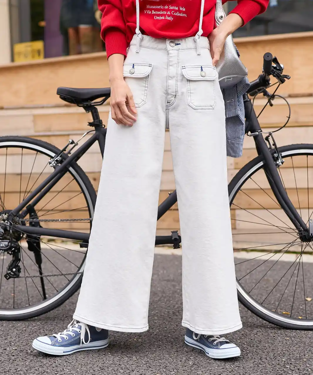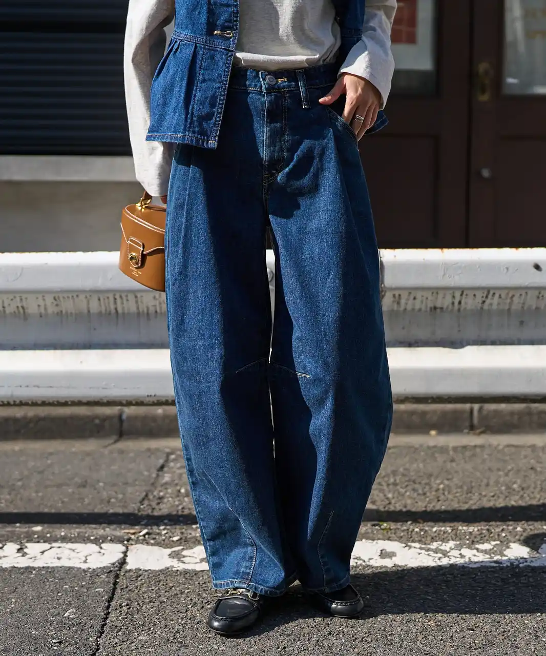 ハイウエストのフィット感と、緩やかなカーブがかった腰回りでスタイルアップ効果◎。バックスタイルのレースアップが目を惹くトレンドデニムです。 |
