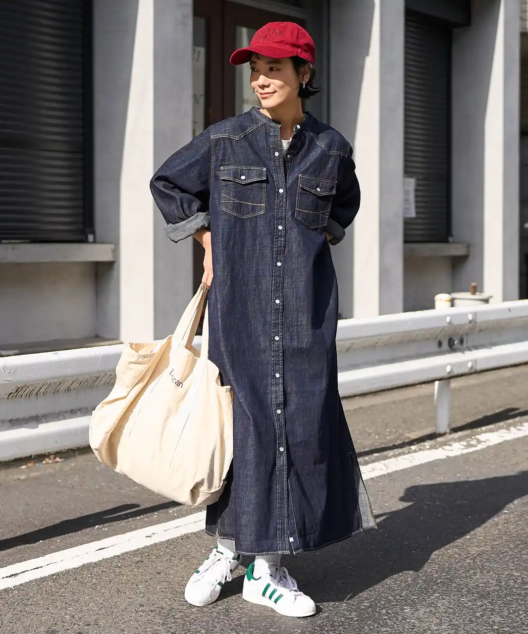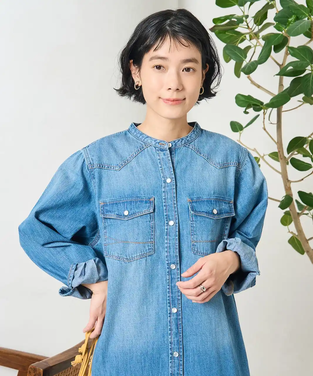 さらっと着られるノーカラーデニムシャツワンピース。程よくゆとりのあるストレートシルエットで体のラインを拾わず、すっきりとした印象に仕上がります。 |