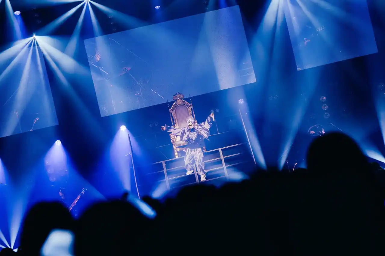 本公演は、1月7日にリリースされた2ndソロアルバム『OVERLORD』の世界観を軸に、“神”“王座”“楽園”といった神話的モチーフと、初兎自身のリアルな感情を重ね合わせたコンセプチュアルなステージとなりました。オープニングから終幕まで一貫した物語性で構成され、観客を深い没入体験へと誘いました。攻撃性と高貴さを併せ持つ楽曲群から、繊細な感情を描くナンバー、さらには「歌ってみた」パートまで、表現の振れ幅を余すことなく会場を魅了しました。