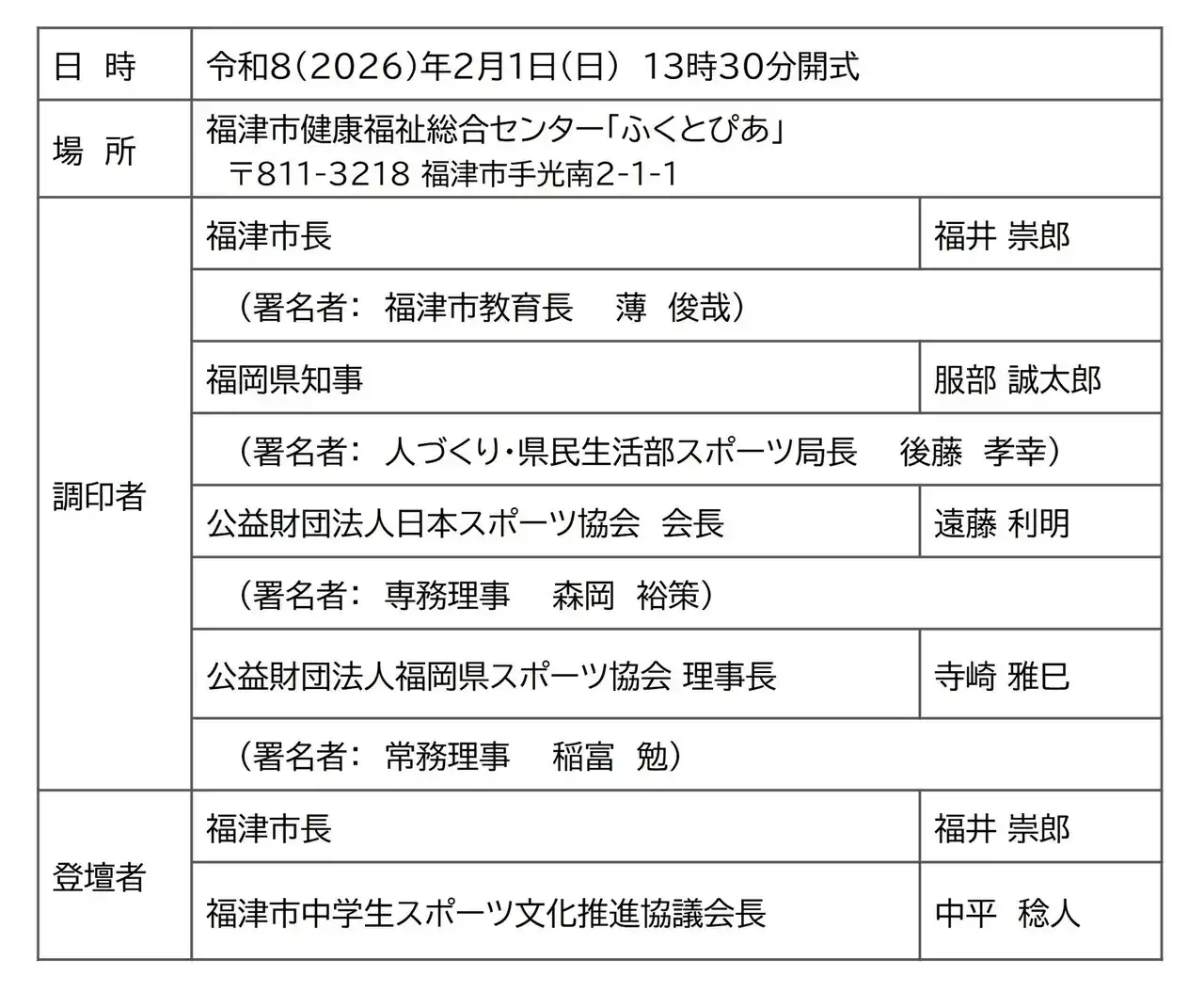 スポーツを「する」「みる」「ささえる」ための環境づくりを行うJSPO(正式名称:公益財団法人日本スポーツ協会 東京都新宿区/会長 遠藤利明)は、福岡県福津市、福岡県、公益財団法人福岡県スポーツ協会と、福津市における中学校運動部活動の地域展開を踏まえ、ジュニアスポーツの環境整備を持続可能な形で推進するため、「福岡県福津市における運動部活動の地域展開を踏まえたジュニアスポーツの環境整備に向けた協力体制に関する連携基本協定」を締結します。 |