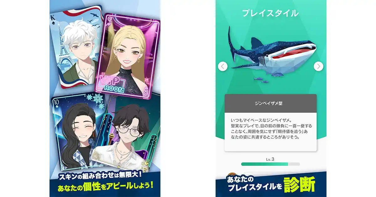 | 実力を試す対戦モードに加え、自分好みに組み合わせを楽しめる「プロフィールカード」のコレクション要素や、プレイスタイルを18種類の「サメ」で診断する機能などカジュアルに楽しむこともできます。 | ||||||||||||||||||||||