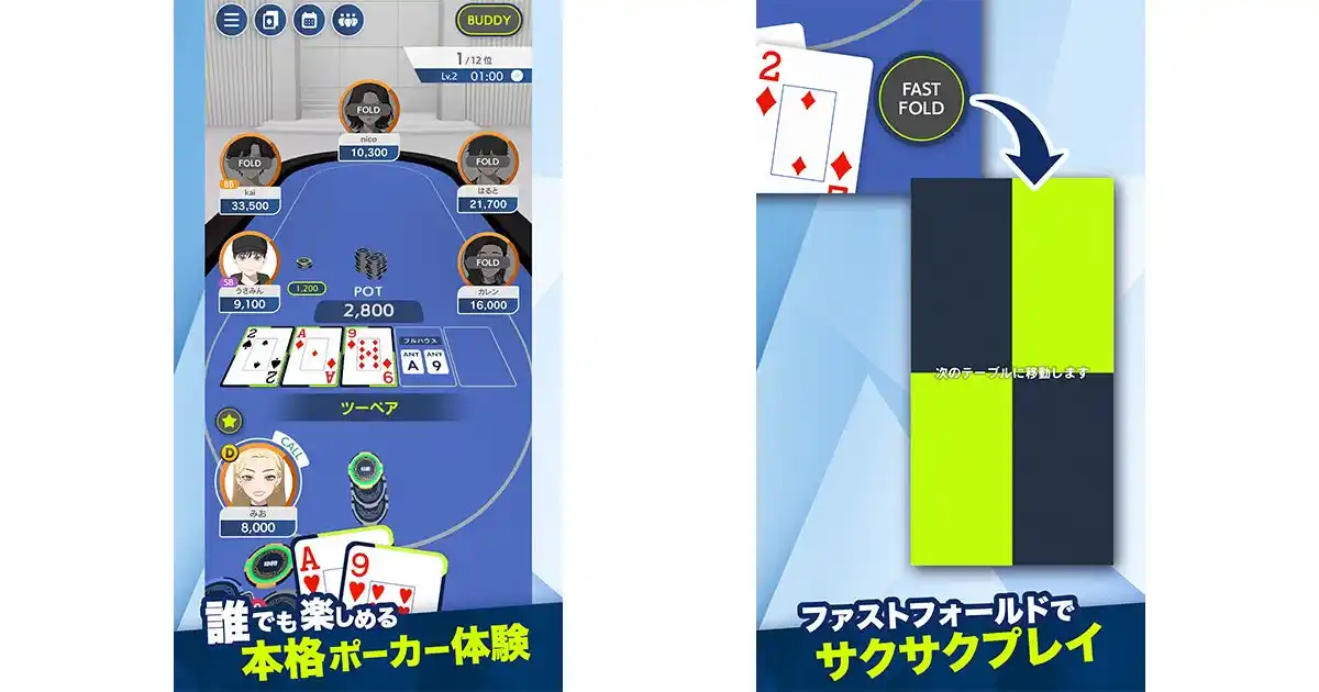 | 本格的な雰囲気を損なわず、誰でも直感的に操作できるUIを実現。ゲームを降りるとすぐに次のテーブルへ移動できる「ファストフォールド」機能は、待ち時間をなくしたテンポの良いプレイ体験を叶えてくれます。 | ||||||||||||||||||||||