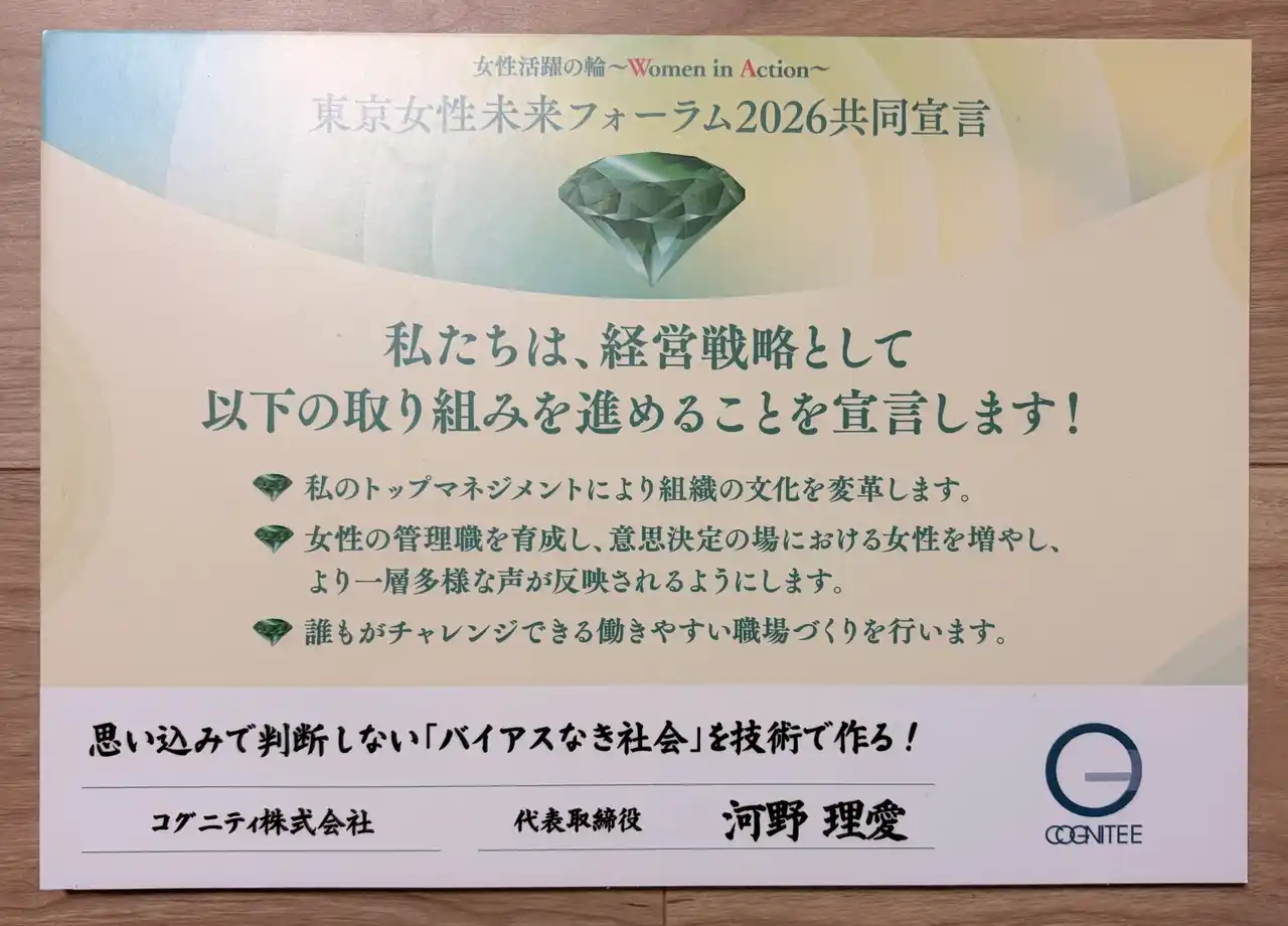 知識表現AIを用い、会話・文章データから組織課題を可視化するコグニティ株式会社(本社:東京都品川区、代表取締役:河野理愛、以下「コグニティ」)は、2026年1月26日(月)に東京国際フォーラムで開催された東京都主催イベント「東京女性未来フォーラム2026」に参加し、小池百合子東京都知事ならびに参加企業のトップ等とともに、女性活躍・ダイバーシティ経営の推進に向けた「共同宣言」に登壇しました。 「東京女性未来フォーラム2026」は、企業経営者の意識改革や職場文化の変革を後押しし、男女ともに活躍できる環境づくりを社会全体に広げることを目的に開催され、基調対談や中高生による提言発表、女性経営者の表彰、そして共同宣言などが実施されました。 |