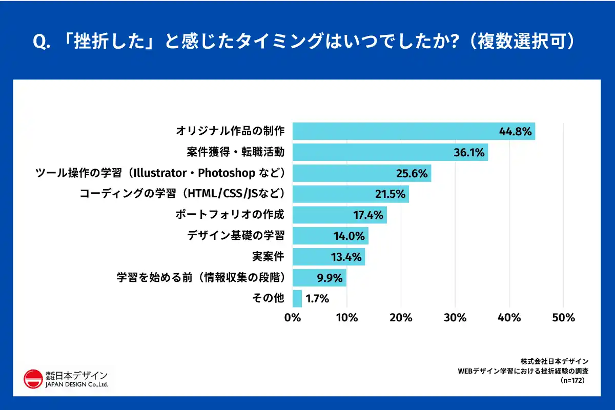 「Q.「挫折した」と感じたタイミングはいつでしたか?(複数選択可)」(n=172)と質問したところ、「オリジナル作品の制作」が44.8%で最多となりました。 |