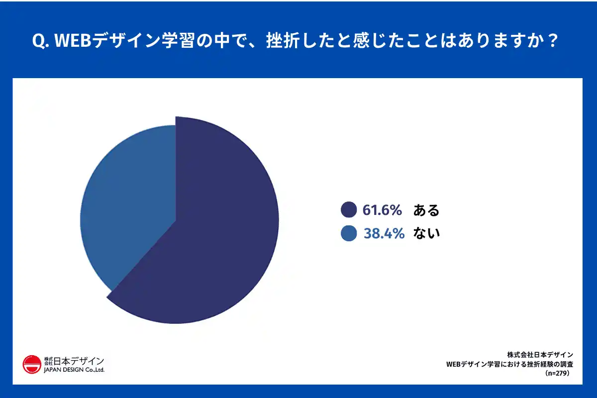 「Q.WEBデザイン学習の中で、挫折したと感じたことはありますか?」(n=279)と質問したところ、「ある(挫折経験あり)」が61.6%となり、約6割が挫折を経験していることがわかりました。 |