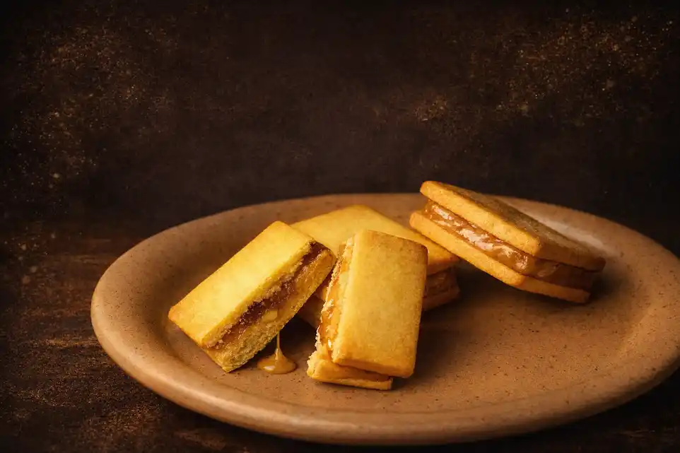 | 生キャラメルのようなくちどけなめらかなキャラメルを香ばしいカカオクッキーでサンドしました。キャラメルには食感のアクセントとしてくるみを入れており、カカオクッキーとキャラメルの間にはDOMORI社の高級チョコレートを入れているので華やかなチョコレートの風味も感じていただけます。 | |||