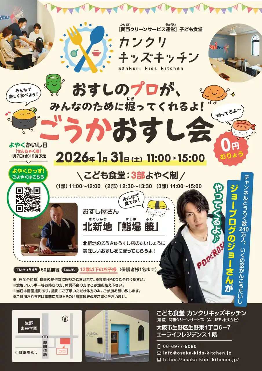 | 関西クリーンサービス(運営:A-LIFE株式会社、代表取締役:亀澤範行)は、2026年1月31日(土)、大阪市生野区に子ども食堂「カンクリキッズキッチン」をオープンいたします。 | ||||||||||||||