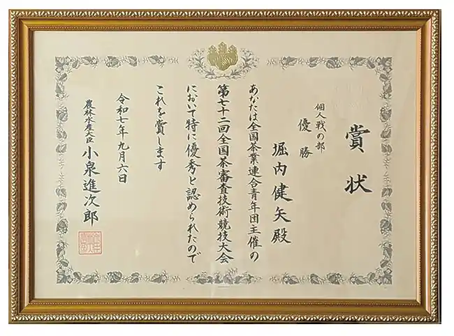 東京都江東区で開催された「第72回全国茶審査技術競技大会」において、製茶問屋・丸堀製茶株式会社(本社:静岡県掛川市、代表:堀内尚)の堀内健矢が個人戦で優勝し、日本一の栄誉である農林水産大臣賞を受賞しました。 |