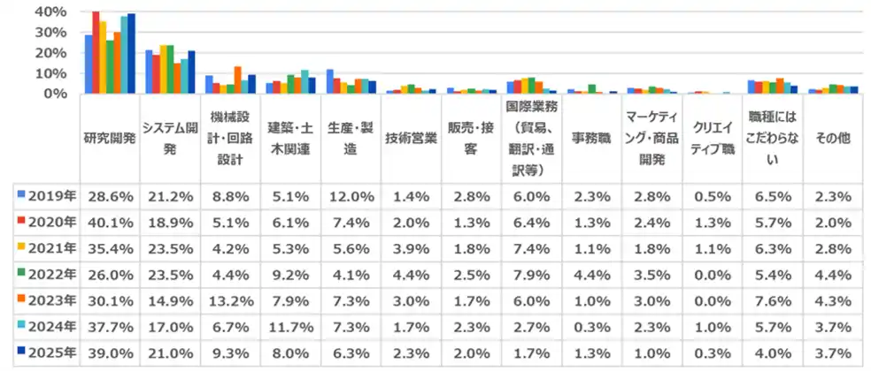 1位「研究開発」(39.0%)、2位「システム開発」(21.0%)、3位「機械設計・回路設計」(9.3%)となりました。1位の「研究開発」が2019年から変わらず人気の理由は、回答者の多くが大学院生※であることが考えられます。 |