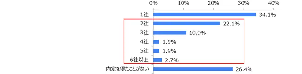 最も多かったのが「1社」(34.1%)でした。また、2社以上と回答したのが39.5%(22.1%+10.9%+1.9%+1.9%+2.7%)となり、約4割もの留学生が複数の企業から内定を得たことがわかりました。 |