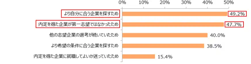 「より自分に合う企業を探すため」(49.2%)と「内定を得た企業が第一志望ではなかったため」(47.7%)がともに約半数となりました。 |