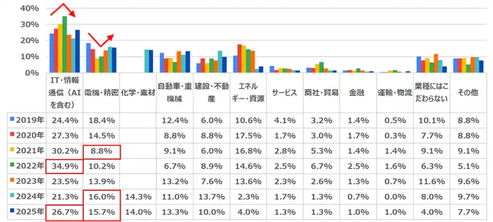 1位「IT・情報通信(AIを含む)」(26.7%)、2位「電機・精密」(15.7%)、3位「化学・素材」(14.0%)となりました。 |