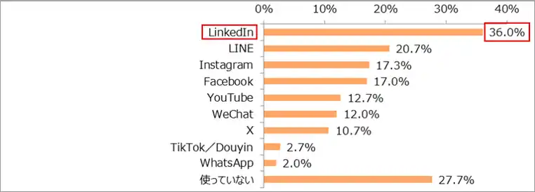 「LinkedIn」(36.0%)が最も多く、4割近くが回答。「LINE」(20.7%)、「Instagram」(17.3%)、「Facebook」(17.0%)も約2割となりました。その一方で、SNSを「使っていない」と回答した留学生も約3割(27.7%)いることがわかりました。 |