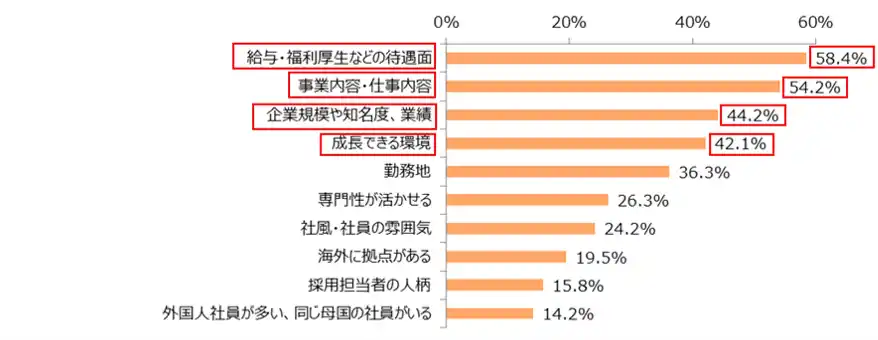 1位「給与・福利厚生などの待遇面」(58.4%)、2位「事業内容・仕事内容」(54.2%)、3位「企業規模や知名度、業績」(44.2%)という結果になりました。また、4位「成長できる環境」も4割(42.1%)を超え、留学生の成長意欲の高さがうかがえます。 |