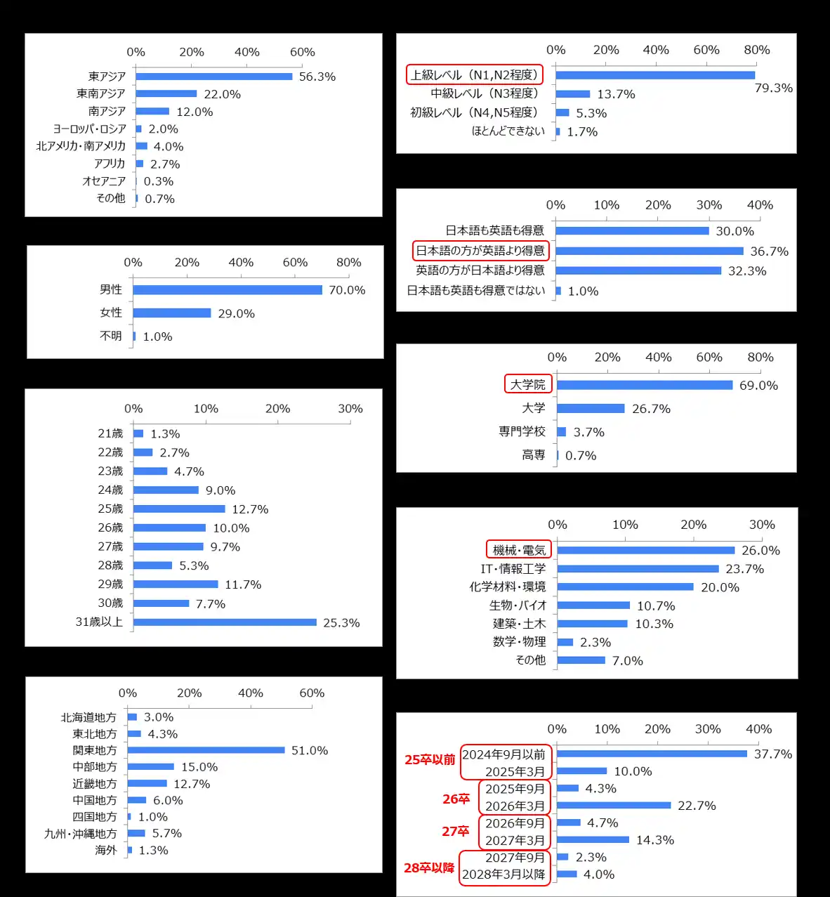 【回答者の属性】 『リュウカツ』登録者の特長である、高学歴で日本語レベルが高い理系留学生が多数 |