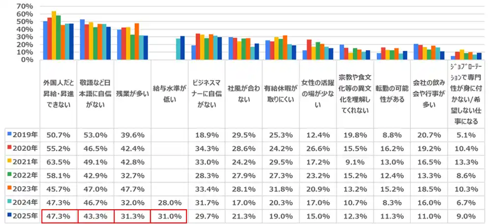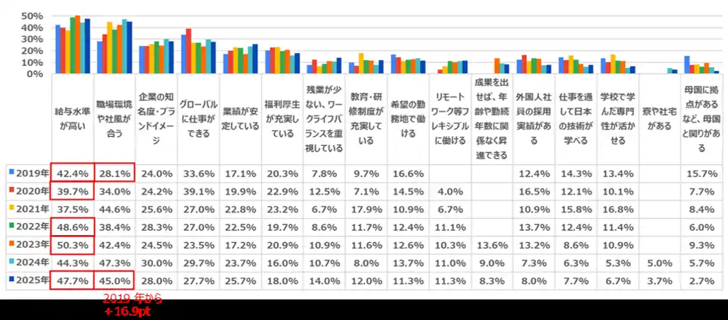 2020年に約5割(46.8%)だった「給料が高い」は16.1pt減少しました。また、「将来、母国に帰ってキャリアが活かせる」も2023年の39.7%をピークに減少しています。 |