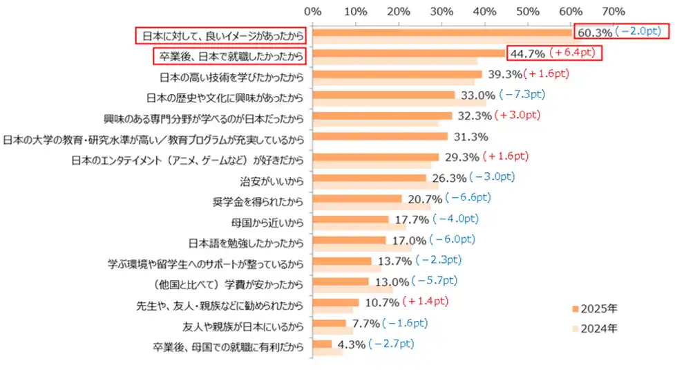 ● 日本に留学した理由、2位の「卒業後、日本で就職したかった」が前年比6.4pt増の44.7%に |