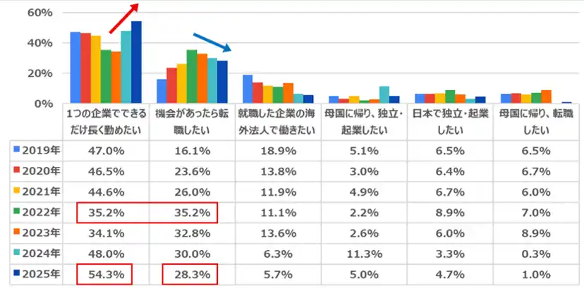 日本の企業に就職した場合のキャリアプランを聞いたところ、「1つの企業でできるだけ長く勤めたい」(54.3%)が最も多く、調査開始の2019年から初めて5割を超えた。[2-Q6]