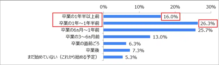 「卒業の1年~1年半前」(26.3%)と「卒業の6ヵ月~1年前」(25.7%)に就職活動を始めた留学生が多いことがわかりました。また、卒業の1年以上前と回答したのは、42.3%(26.3%+16.0%)となり、日本人学生と同様に、早期に開始する留学生が多いことがわかりました。 |