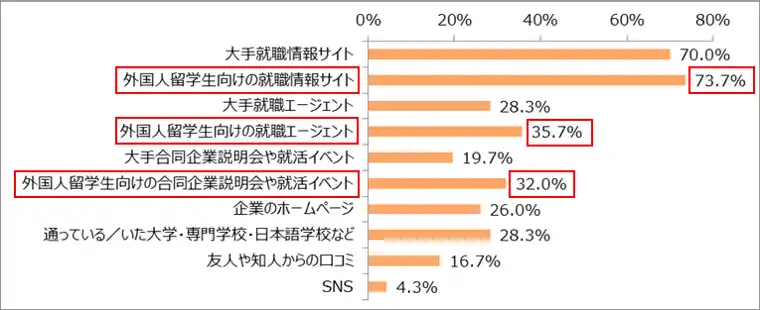 「外国人留学生向けの就職情報サイト」(73.7%)、「大手就職情報サイト」(70.0%)がともに7割を超えました。なお、就職情報サイト、就職エージェント、合同企業説明会や就活イベントは、どれも“外国人留学生向け”が高い割合となりました。 |