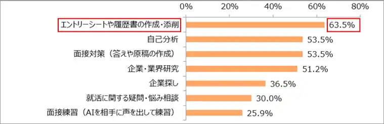 「エントリーシートや履歴書の作成・添削」(63.5%)が最多となり、次いで、「自己分析」(53.5%)、「面接対策(答えや原稿の作成)」(53.5%)、「企業・業界研究」(51.2%)がほぼ同率でした。 |