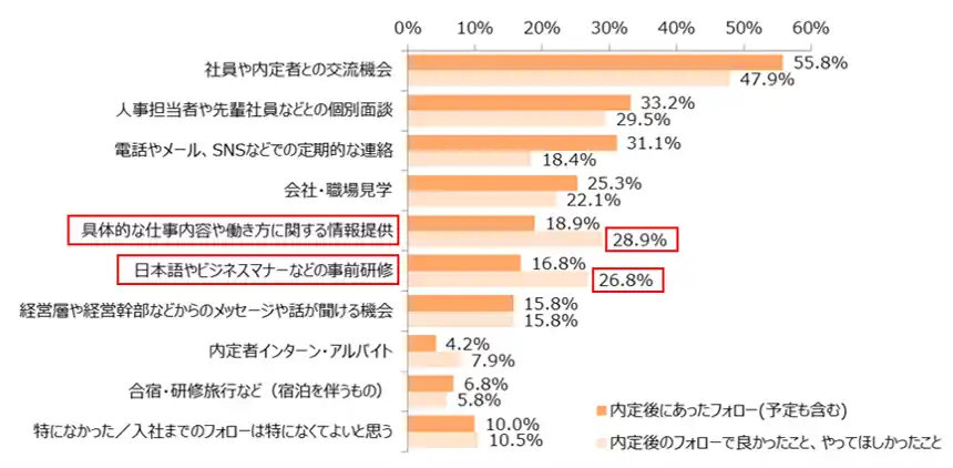 内定後のフォローで良かったこと、やってほしかったことも同時に聞いた結果、「社員や内定者との交流機会」(47.9%)、「人事担当者や先輩社員などとの個別面談」(29.5%)、「具体的な仕事内容や働き方に関する情報提供」(28.9%)、「日本語やビジネスマナーなどの事前研修」(26.8%)となりました。 |