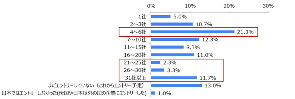 最も多かったのが「4~6社」(21.3%)でした。また、21社以上と回答したのが17.3%(2.3%+3.3%+11.7%)となり、約2割の留学生が日本人学生と同様に多くの企業にエントリーしたことがわかりました。 |