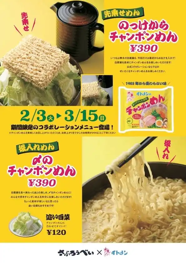 | 石川県のソウルフードとして、75年に渡り愛される「さぶろうべい」を展開する株式会社SU-BEE(本社:石川県金沢市、CEO:田端 弘一)は、石川県の土曜のお昼ご飯の定番として愛されている「チャンポンめん」を製造販売するイトメン株式会社(本社:兵庫県たつの市、代表取締役:伊藤 充弘)とコラボレーションし、外食と家庭食の“いつもの味”が一緒に楽しめるコラボメニューを、2026年2月3日(火)~3月15日(日)までの期間限定で販売いたします。 | |||||||||